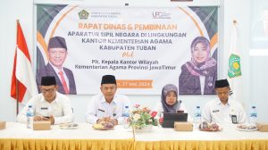 Kepala Kantor Kementerian Agama Kabupaten Tuban, Hj. Umi Kulsum, S.Ag, M.Pd.I., dalam sambutannya menyampaikan terima kasih kepada Plt. Kepala Kanwil Kemenag Jatim atas arahan dan bimbingannya. Hj. Umi Kulsum juga mengajak seluruh ASN di lingkungan Kantor Kementerian Agama Kabupaten Tuban untuk berkomitmen dalam melaksanakan tugas dan fungsi dengan sebaik-baiknya.