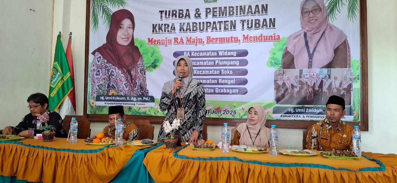 Kepala Kantor Kementerian Agama Kabupaten Tuban Umi Kulsum melakukan pembinaan kepada guru RA se Kabupaten Tuban. Giat yang diusung oleh KKRA (Kelompok Kerja Raudhatul Athfal) ini bertempat di Kantor Majelis Wakil Cabang (MWC) Nahdlatul Ulama (NU) Kecamatan Rengel, Jumat (11/7/2025) yang diikuti oleh 162 peserta dari 5 kecamatan meliputi Rengel, Widang, Plumpang, Soko dan Grabagan.