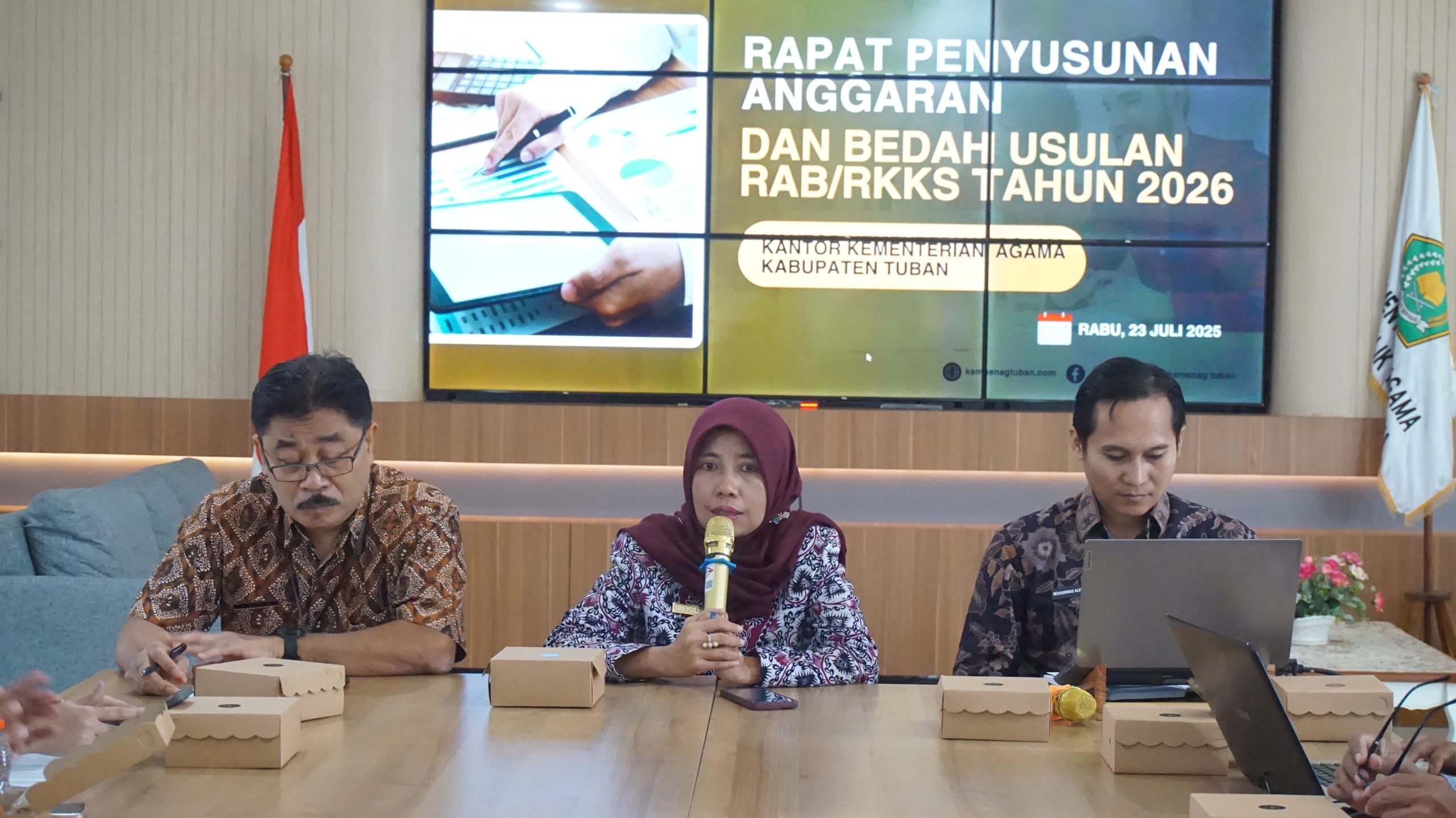 Kementerian Agama Kabupaten Tuban yang dimotori oleh Sub Bagian Tata Usaha menggelar Rapat Penyusunan Anggaran dan Bedah Usulan RAB/RKKS Tahun 2026 di Aula PLHUT, Rabu (23/7/2025). Acara dibuka oleh Kepala Kantor, Umi Kulsum di dampingi Plt. Kasubag TU. Umi mengatakan, rapat ini bukan hanya sekedar menyusun anggaran sesuai keinginan tapi juga menyusun anggaran sesuai kebutuhan. “Didalam pengusulan anggaran ini betul-betul dilakukan sesuai kebutuhan semoga perencana bisa memfasilitasi,” ujarnya.